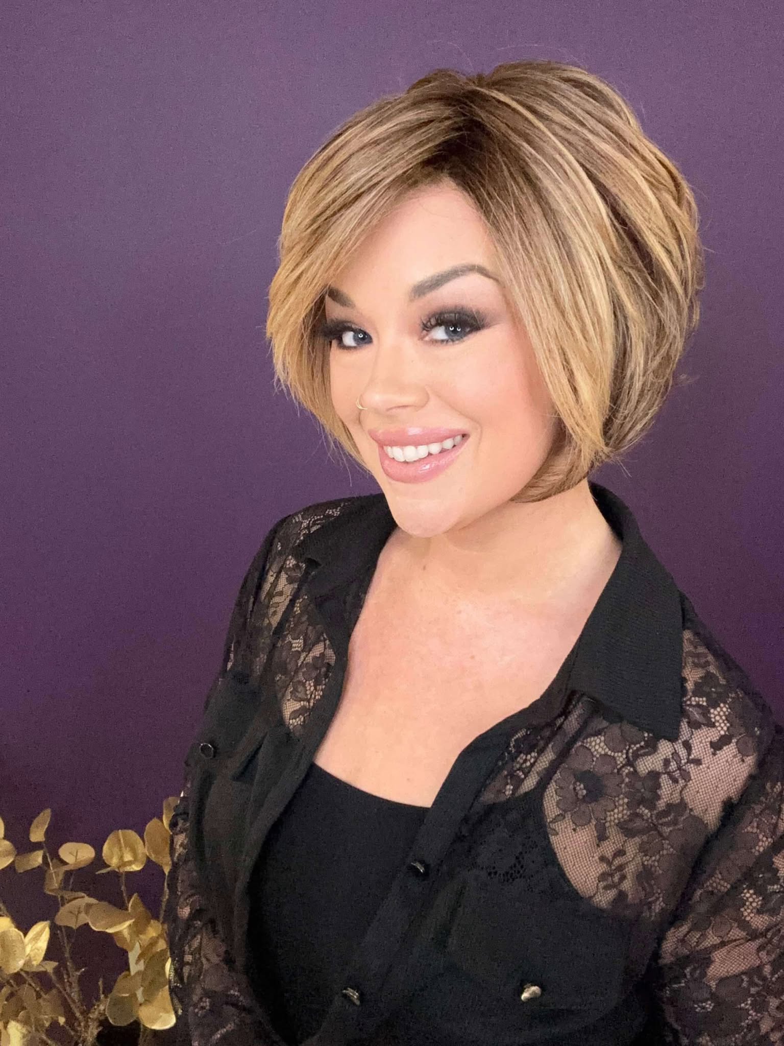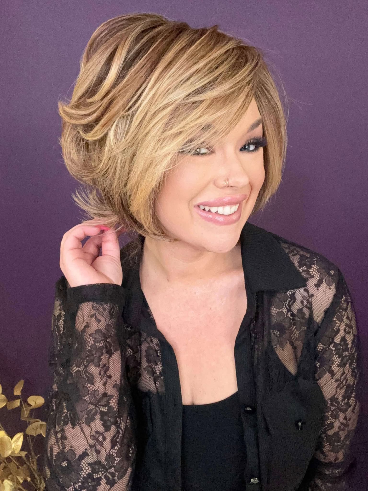 Meet Charlotte 2.0! This beautiful shortie has swooped bangs and layered tousled multi-dimensional wavy curls. Charlotte 2.0 is featured in our stunning Vanilla Spice color.