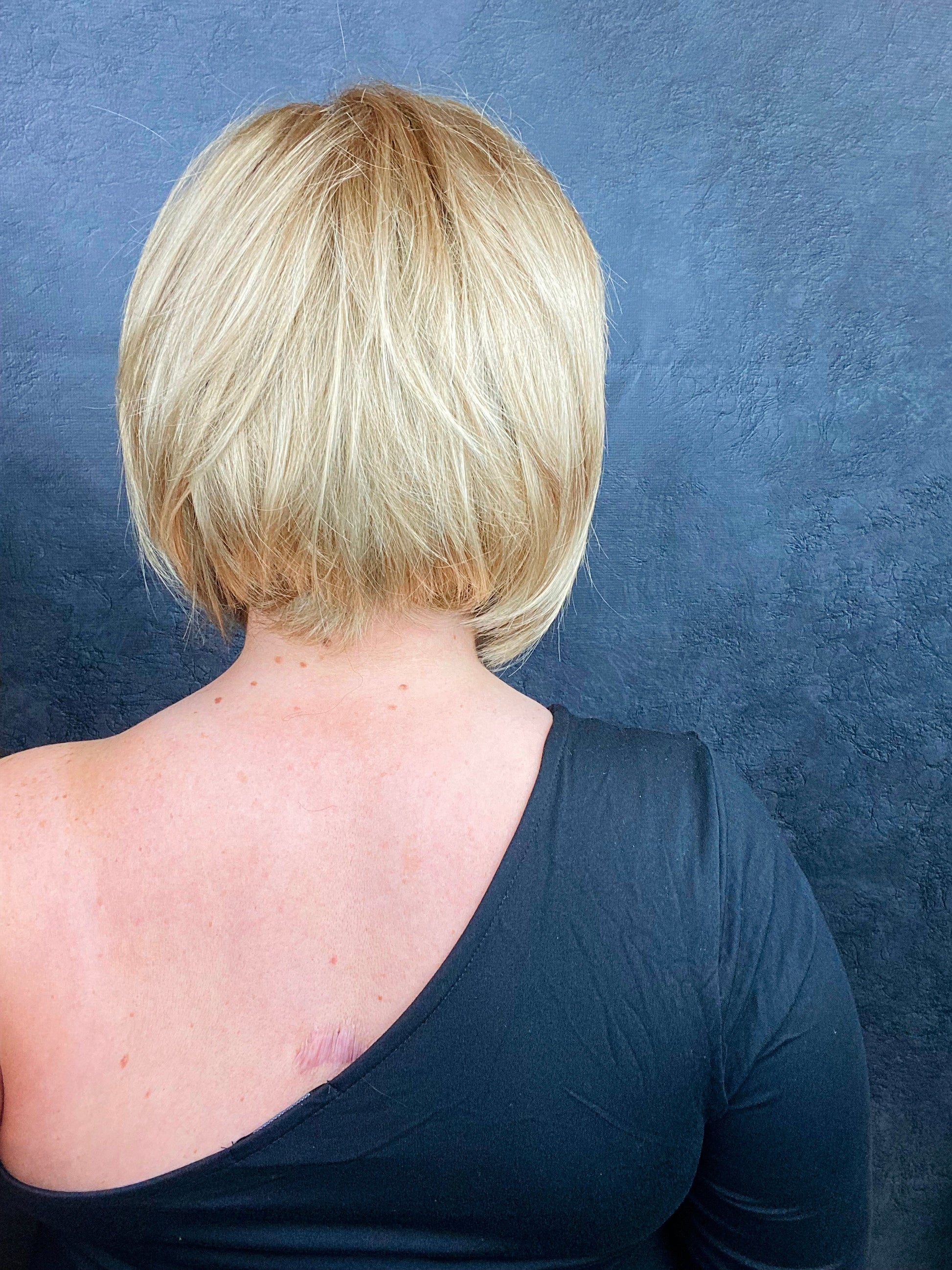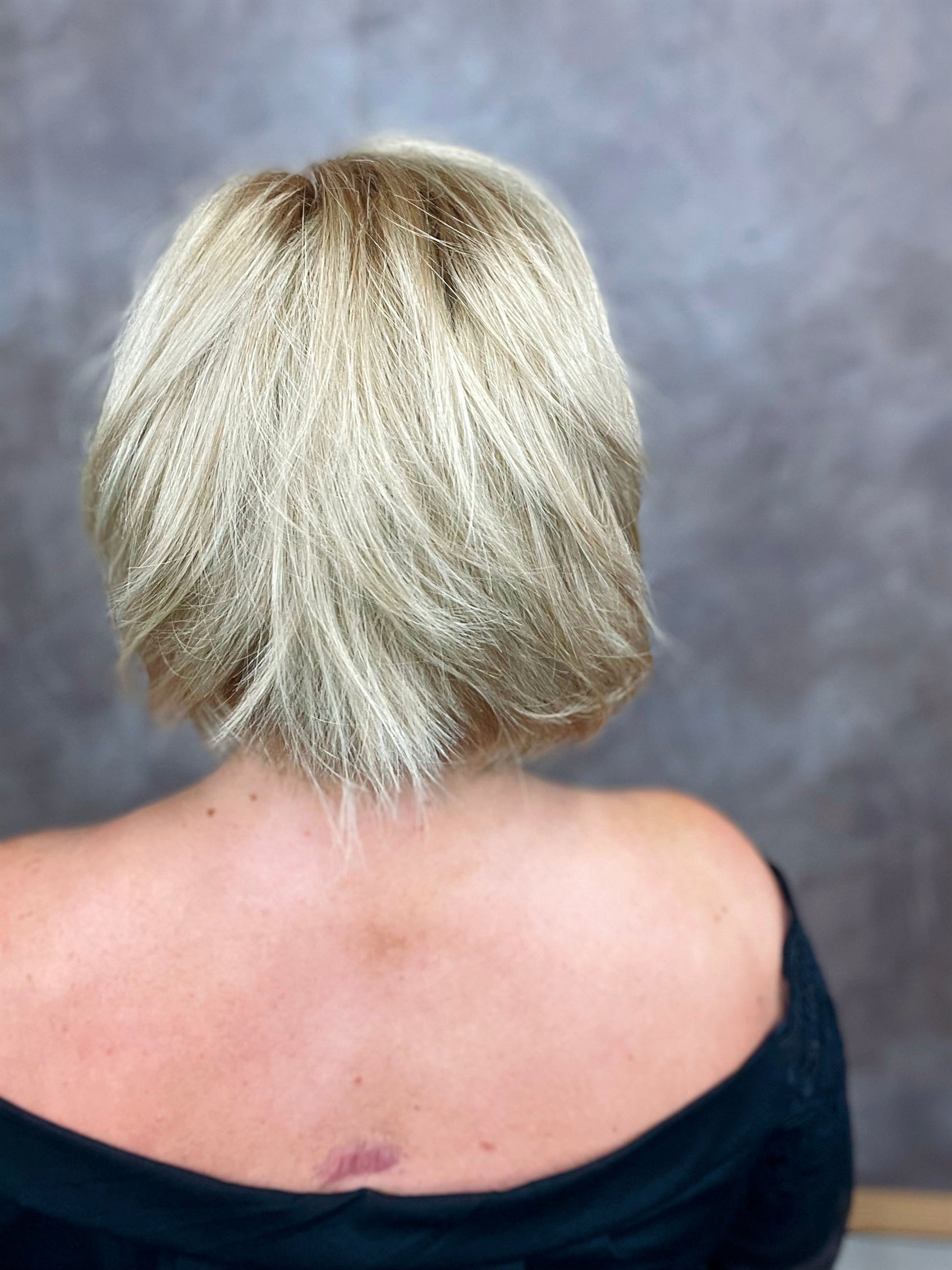 Meet Clarissa! Clarissa has part-anywhere, face-framing bangs graduating into feathered layer bob! This wig is a stunning Satin Gold.