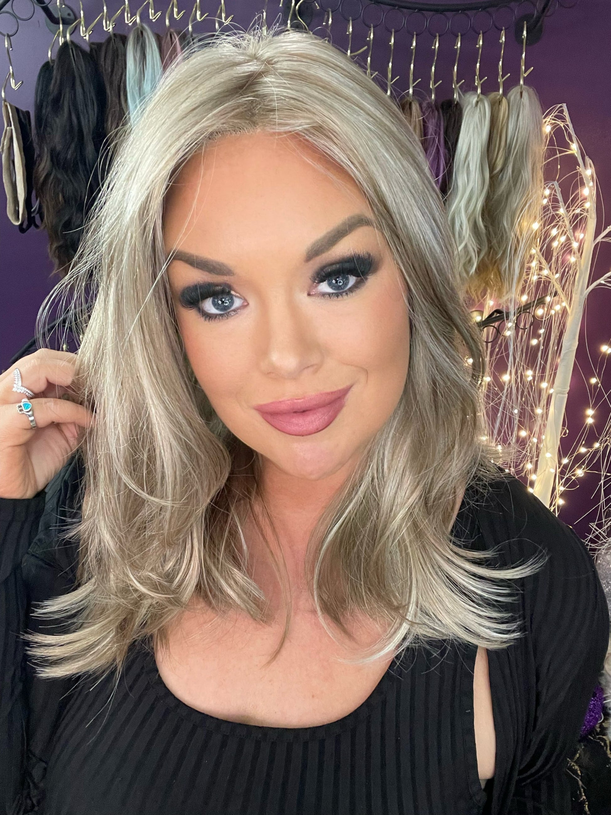 Meet Demi! This wig has part-anywhere, face-framing layers graduating into feathered layers that fall to the mid-back! Demi is featured in our favorite Frosty Blonde!!