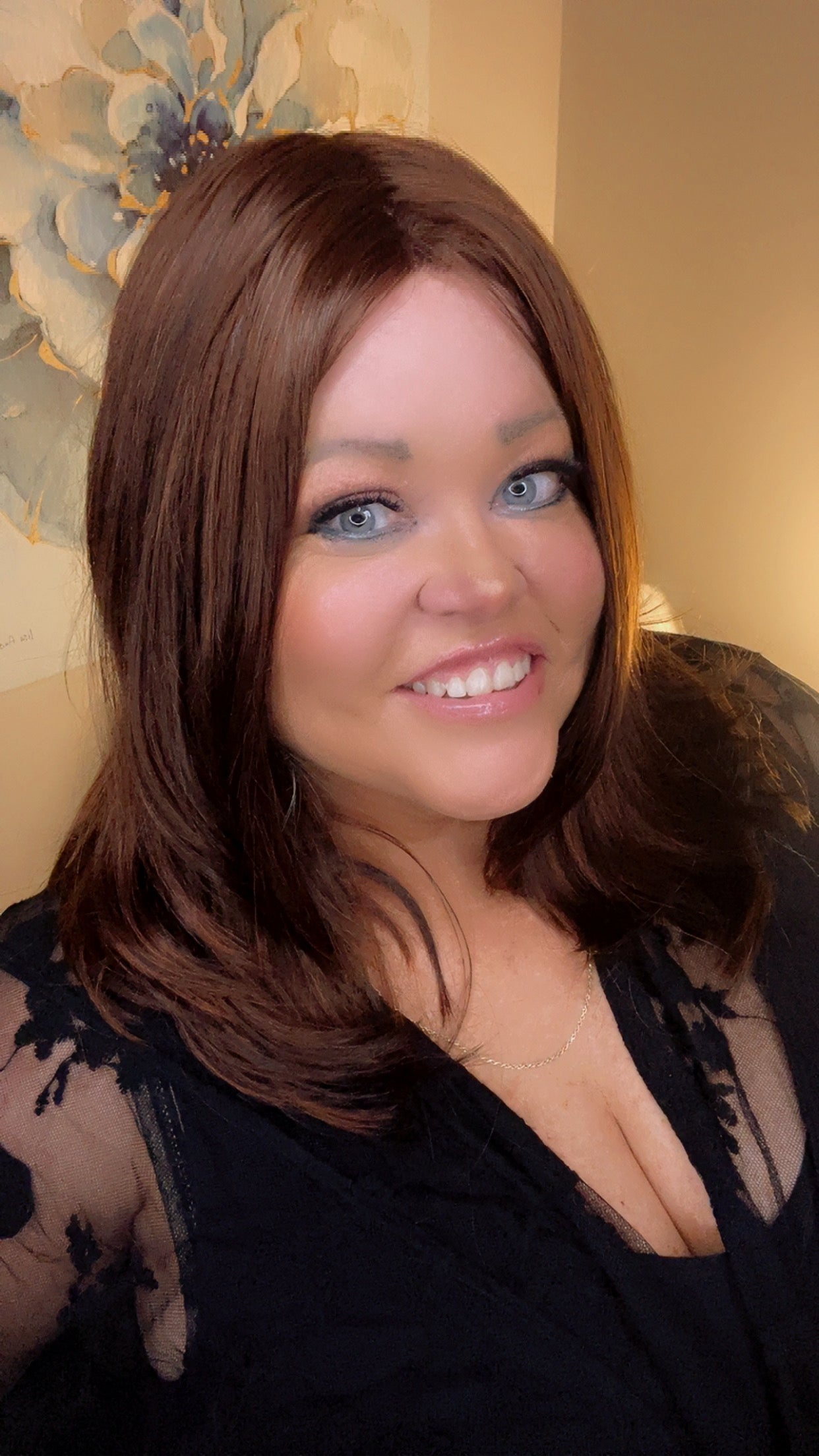 Meet Demi! This wig has part-anywhere, face-framing layers graduating into feathered layers that fall to the mid-back! Demi is featured in Sheer Plum!!