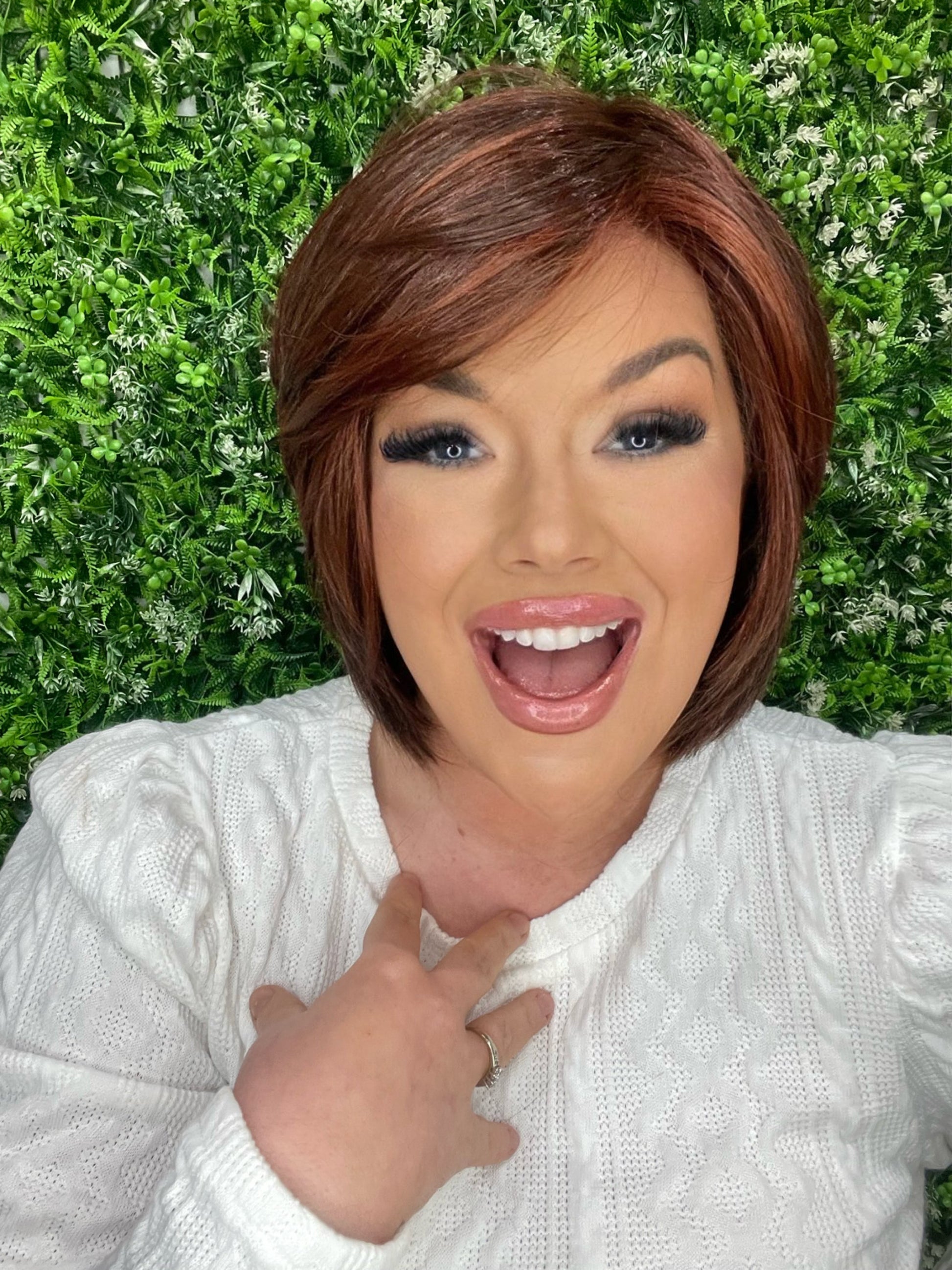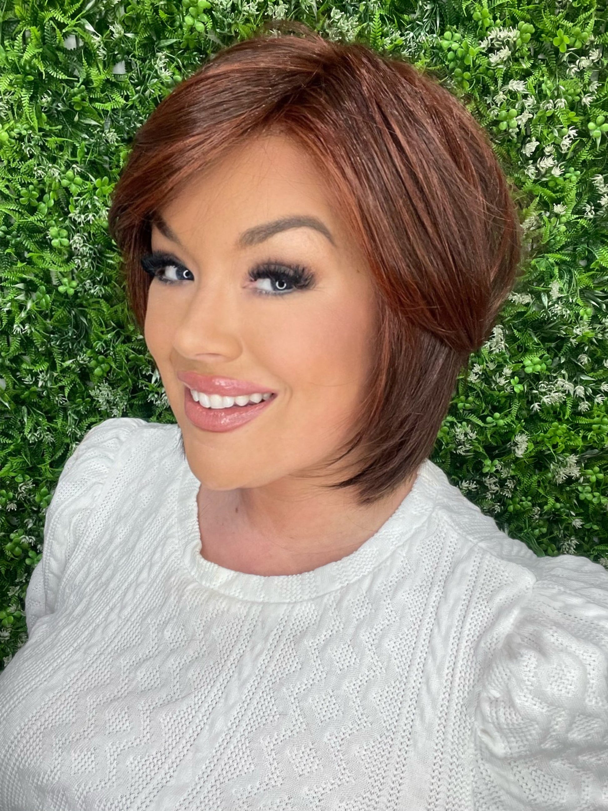 Meet Emma! This gorgeous shortie has lots of fun face framing layers and has super sexy swoopy bangs that lay perfectly to give you that photoshoot ready look! Emma is featured in our stunning Dark Cherry color.