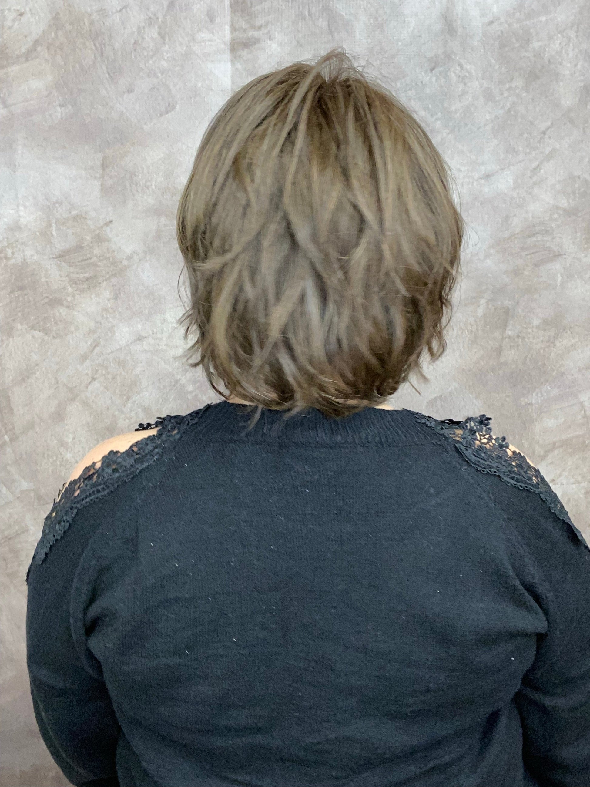 Meet Hattie, formerly known as Bethany! She is a stunning natural-looking lady...she has a warm brown root fading into a natural grey blonde. She is a sexy shag cut bang with a short style wavy bob. She features our stunning Milk Chocolate Brown color.