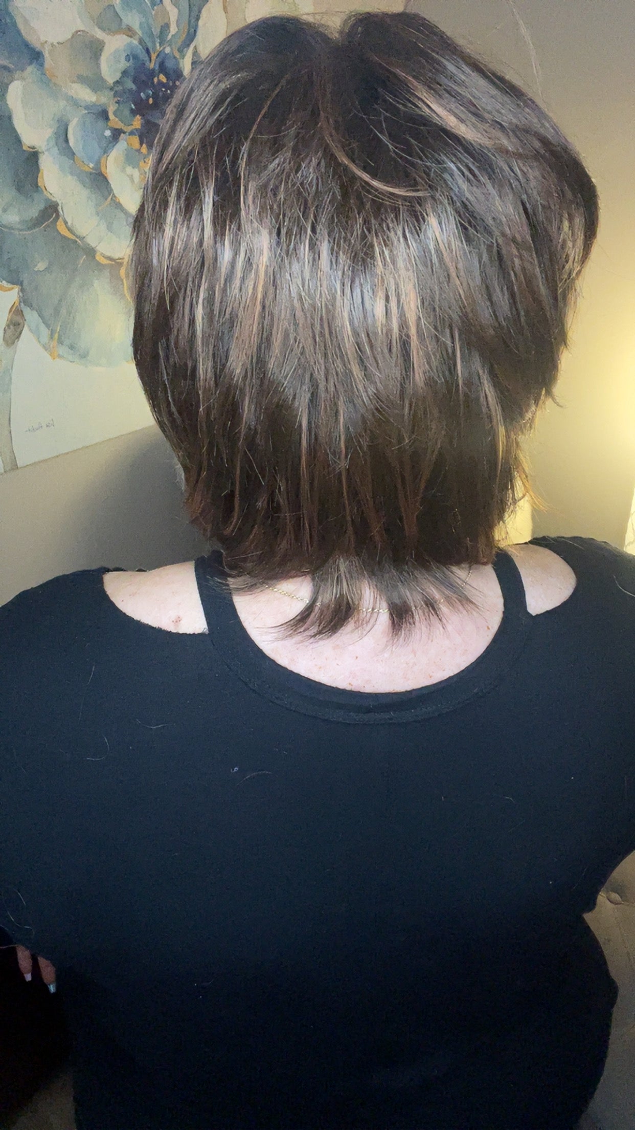 Meet Lola! This gorgeous pixie cut shag has an extended nape and plenty of face framing length on the sides to frame the face or be worn behind the ears. She is featured in our stunning Cherrywood color.
