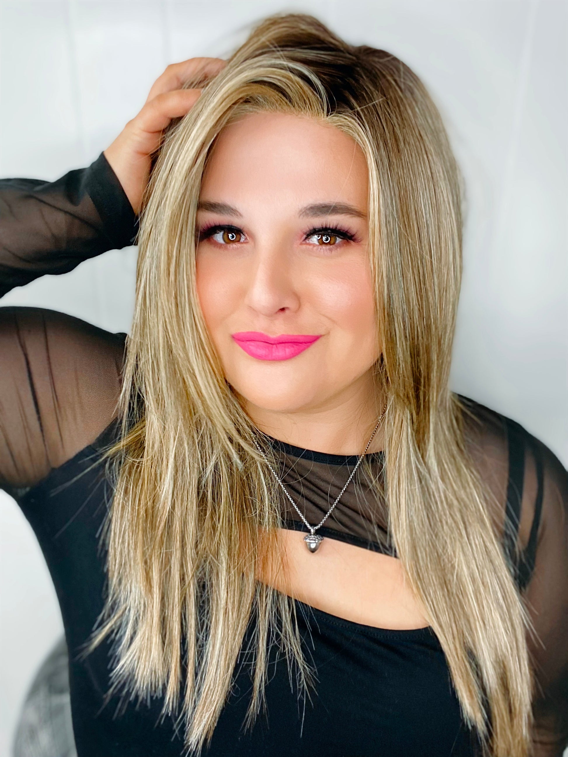 Meet Maggie! Talk about long and beautiful!! This gorgeous long length wiggie is a show stopper for sure! Maggie is a straight layered wiggie with flattering around the face bangs. that is featured in our stunning Seduction Blonde color.