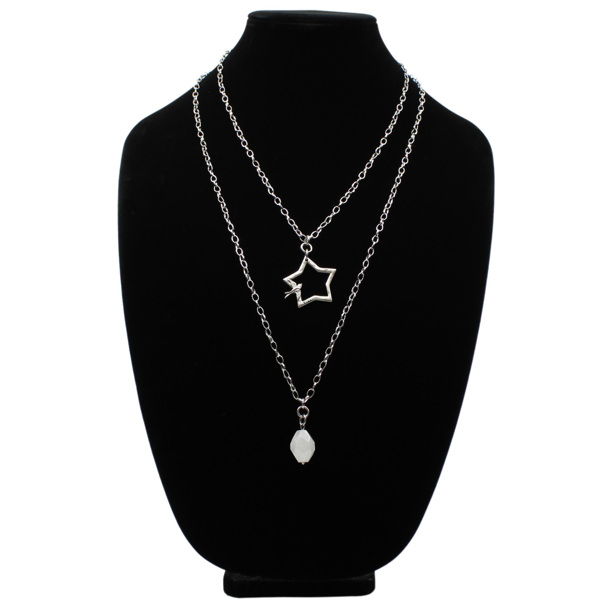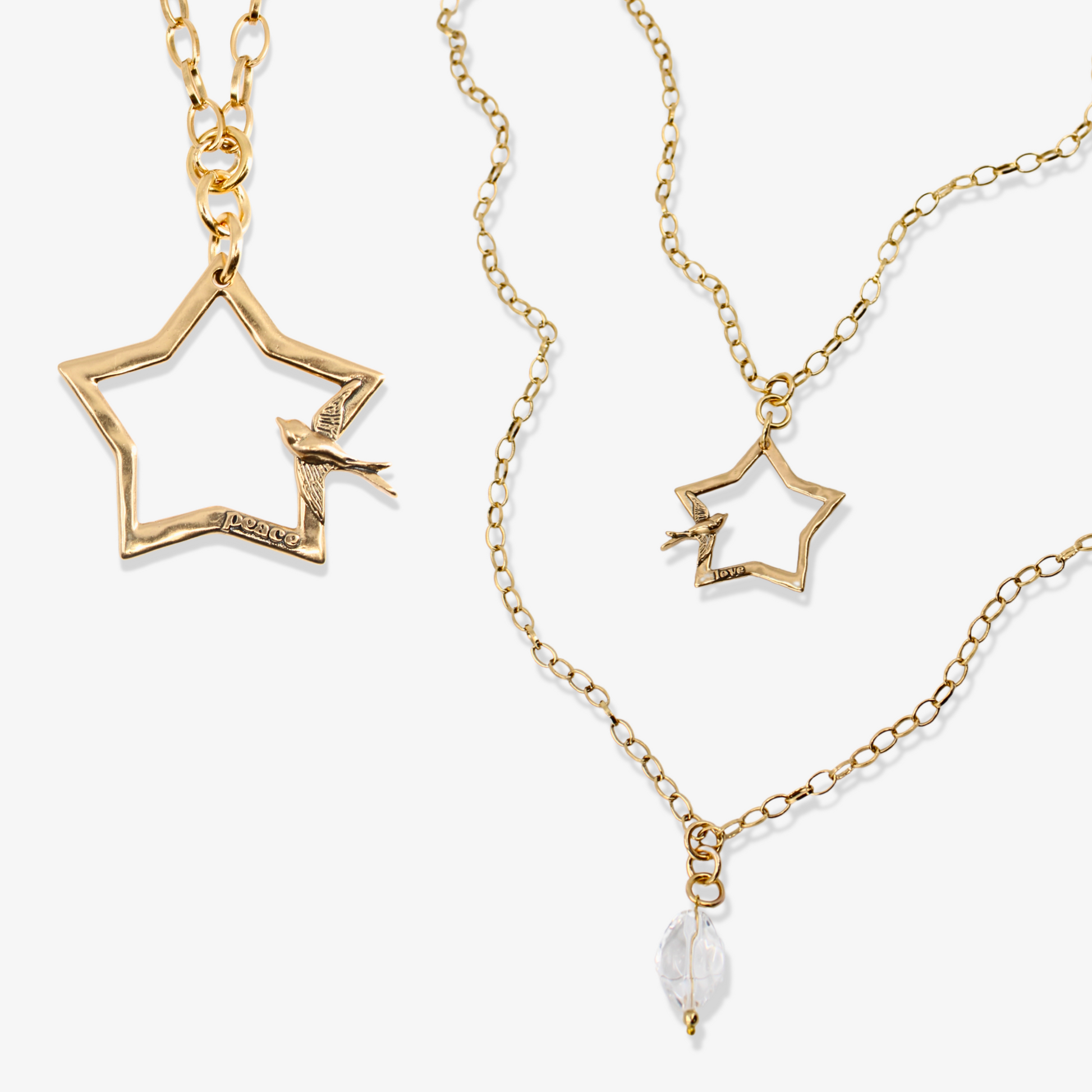 A symbol of serenity and spirit, this 48" stainless steel chain features a double-sided star pendant—engraved with Peace on one side and Love on the other—anchored by a graceful bird at its center. Paired with a crystal quartz drop for clarity and balance.