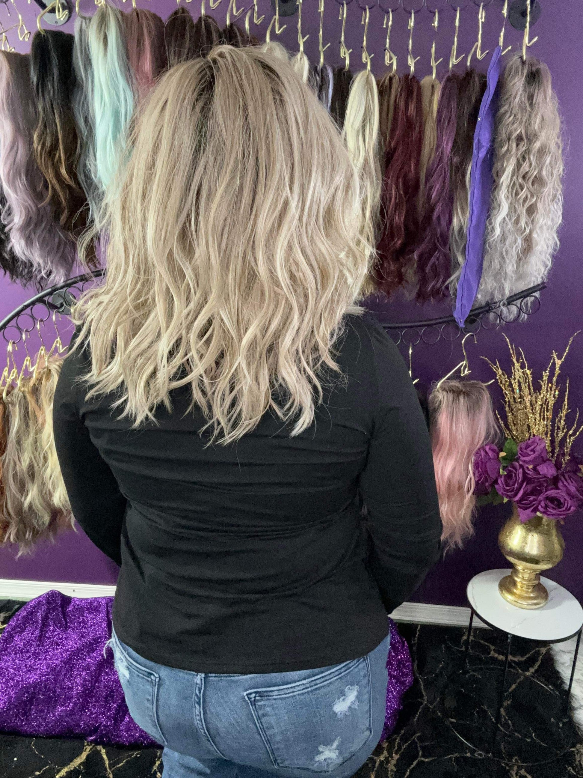 Meet Tina! Tina features mid-length layers of shaped beach waves that tumble to the shoulder with feathered bangs! This wig comes in our stunning Smoking Hot Blonde color.