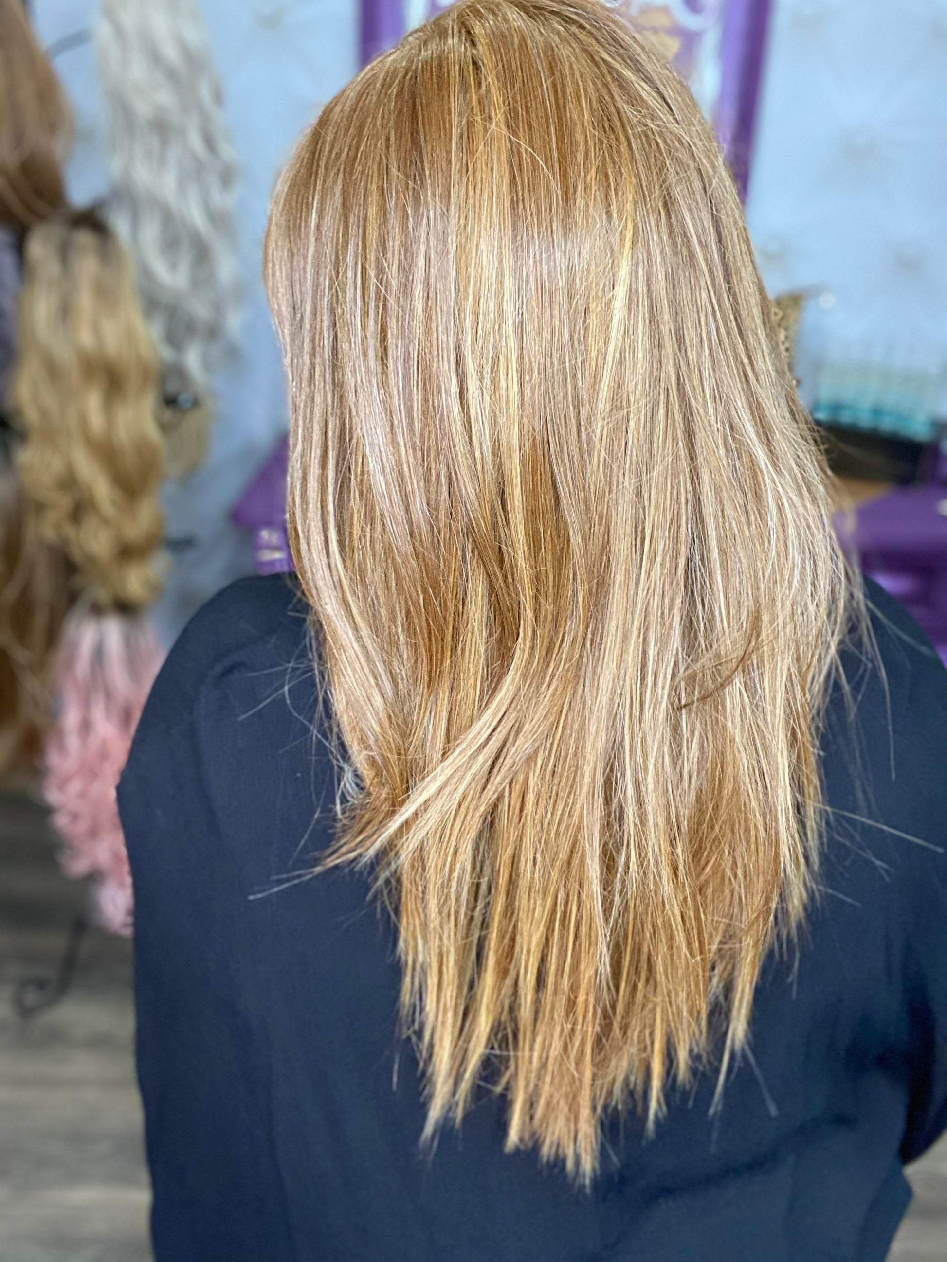 Meet Trinity! Formerly known as Jade! Trinity has gorgeous long-layered face-framing bangs and pin-straight locks. She features our stunning Toffee Blonde color.