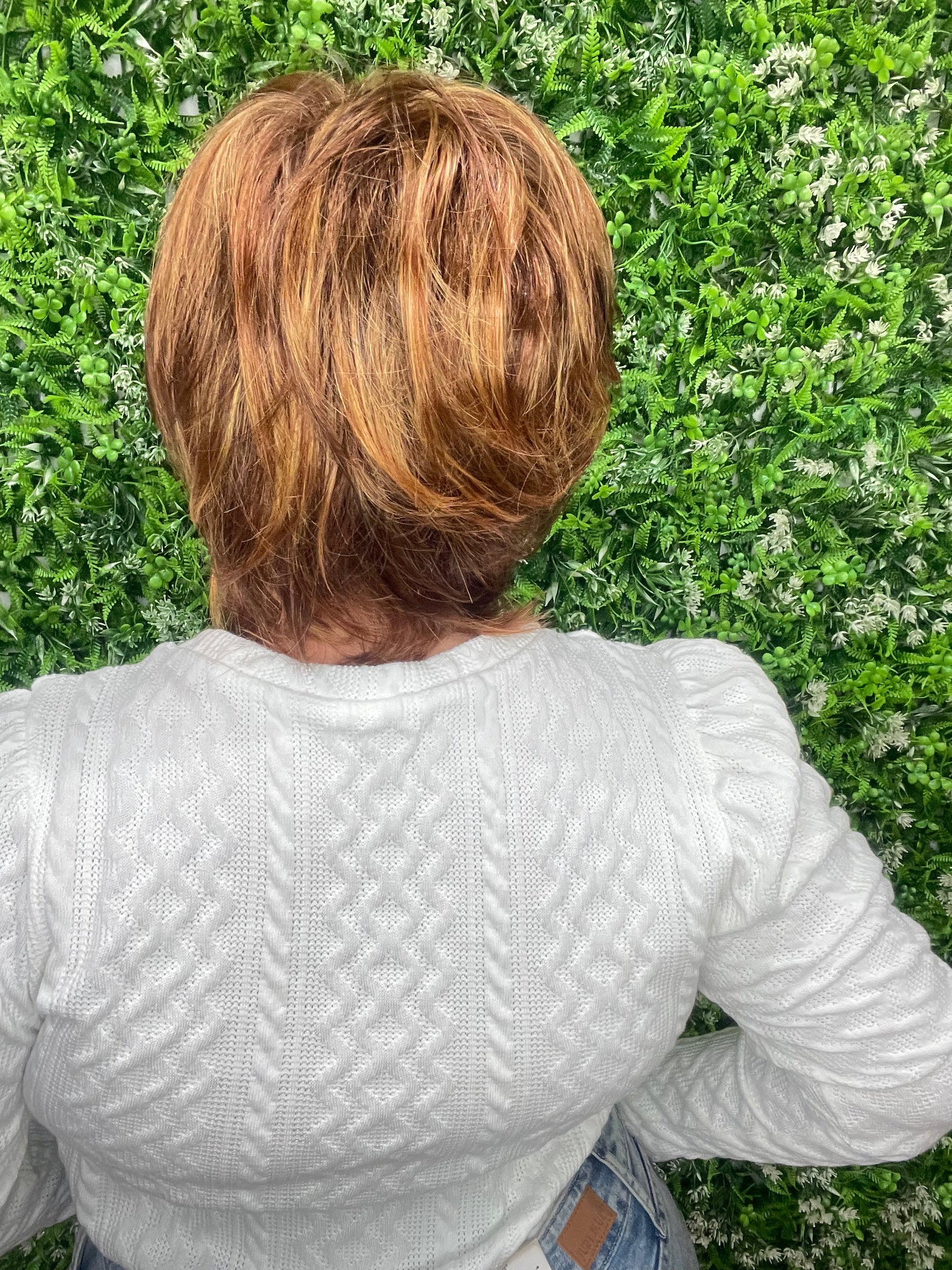 Meet Lola! This gorgeous pixie cut shag has an extended nape and plenty of face framing length on the sides to frame the face or be worn behind the ears. She is featured in our stunning Sunset Glow color.