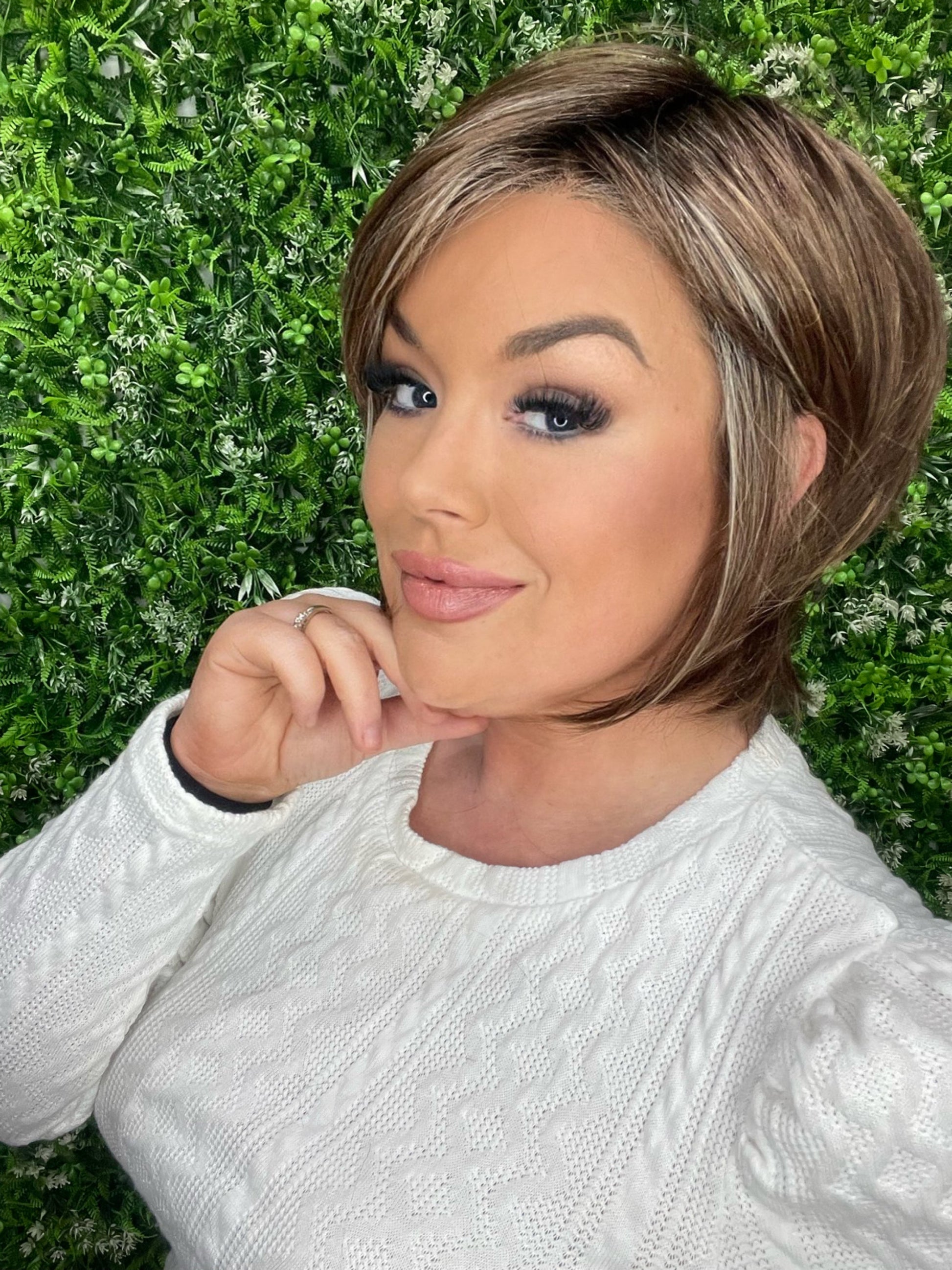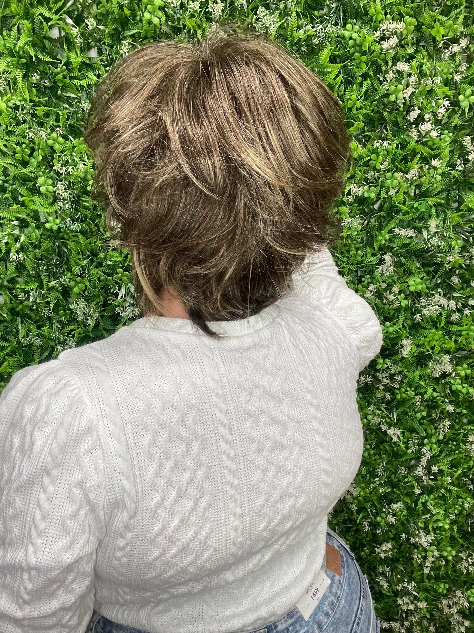 Meet Lola! This gorgeous pixie cut shag has an extended nape and plenty of face framing length on the sides to frame the face or be worn behind the ears. She is featured in our stunning Mocha Gold color.